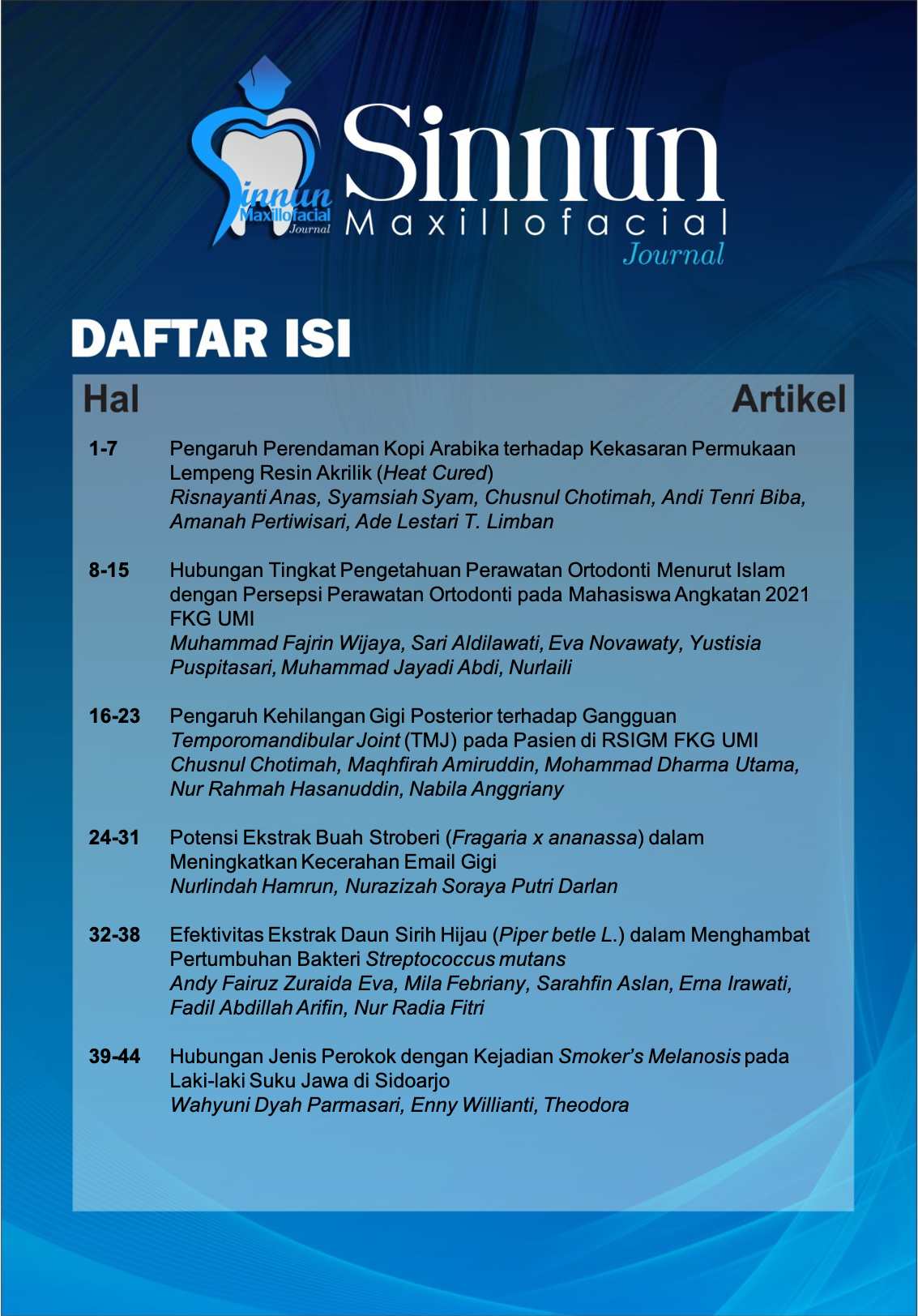 Sinnun Maxillofacial Journal is a publication of scientific work in the field ofdentistry in a broad sense such as peridodontic, pedodontic, conservative dentistry, endodontic, dental material, oral biology, oral and maxillofacial surgery, prosthodontic, orthodontic, dental radiolgy, dental medicine and community dentistry. In addition, the Journal was first established since 2019 by the Institute of Study and Management Center Journal of the Faculty of Dentistry Universitas Muslim Indonesia located in Makassar, South Sulawesi. Sinnun Maxillofacial Journal published on April and October with E-ISSN 2714-5646. This journal has also collaborated with Persatuan Dokter Gigi Indonesia (PDGI) in terms of assisting the advancement of dental health and disseminating research results.