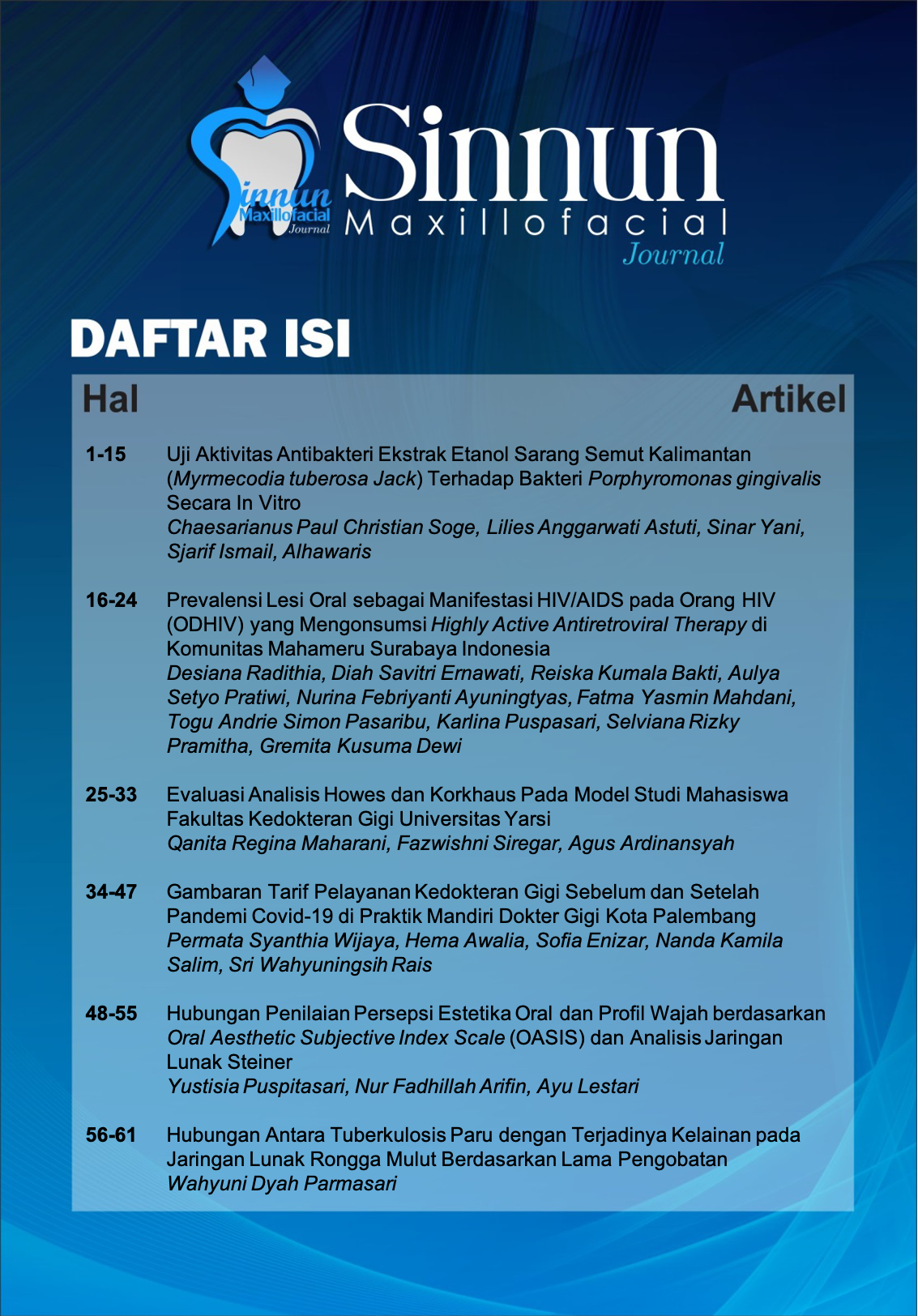 Sinnun Maxillofacial Journal is a publication of scientific work in the field ofdentistry in a broad sense such as peridodontic, pedodontic, conservative dentistry, endodontic, dental material, oral biology, oral and maxillofacial surgery, prosthodontic, orthodontic, dental radiolgy, dental medicine and community dentistry. In addition, the Journal was first established since 2019 by the Institute of Study and Management Center Journal of the Faculty of Dentistry Universitas Muslim Indonesia located in Makassar, South Sulawesi. Sinnun Maxillofacial Journal published on April and October with E-ISSN 2714-5646. This journal has also collaborated with Persatuan Dokter Gigi Indonesia (PDGI) in terms of assisting the advancement of dental health and disseminating research results.