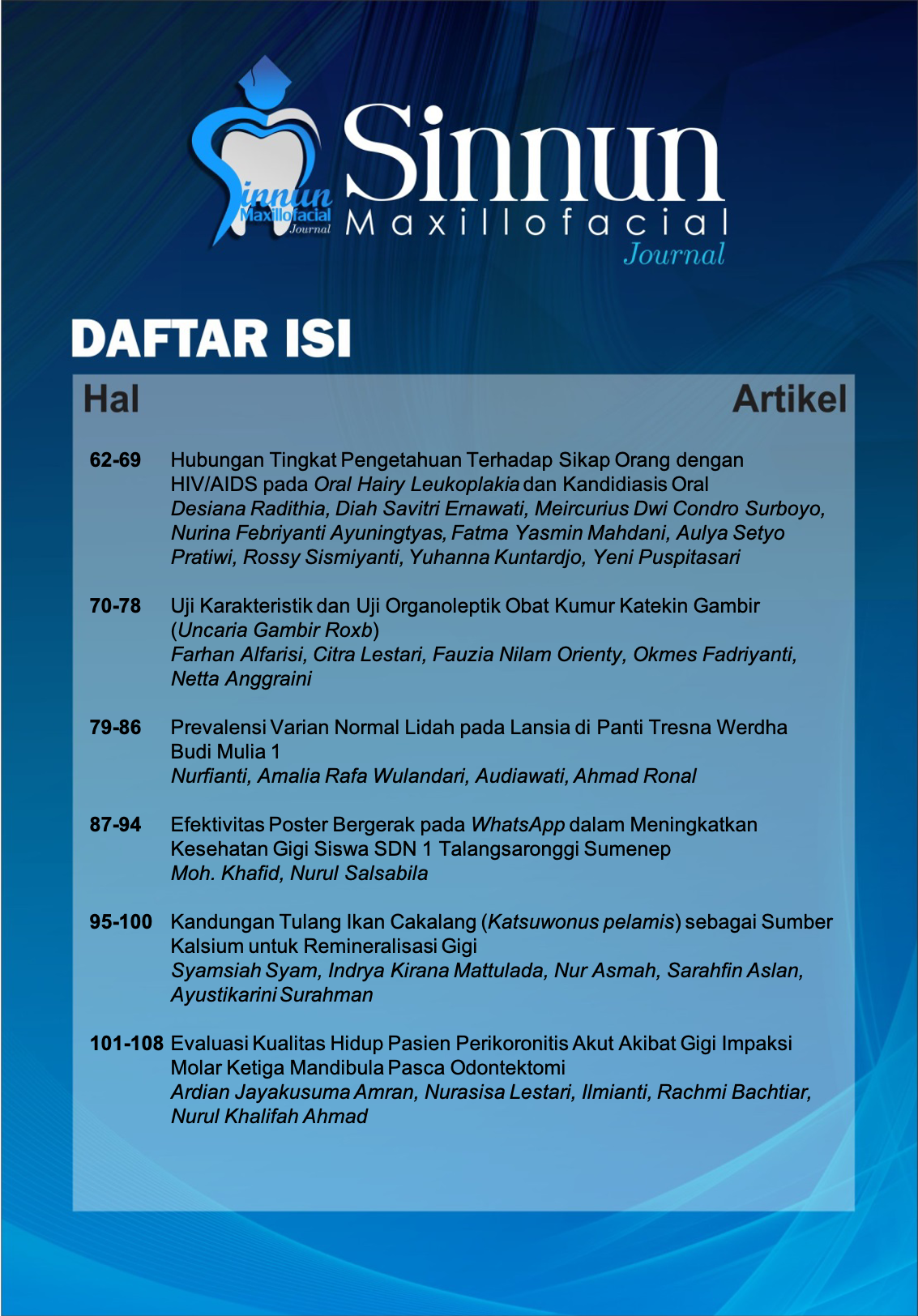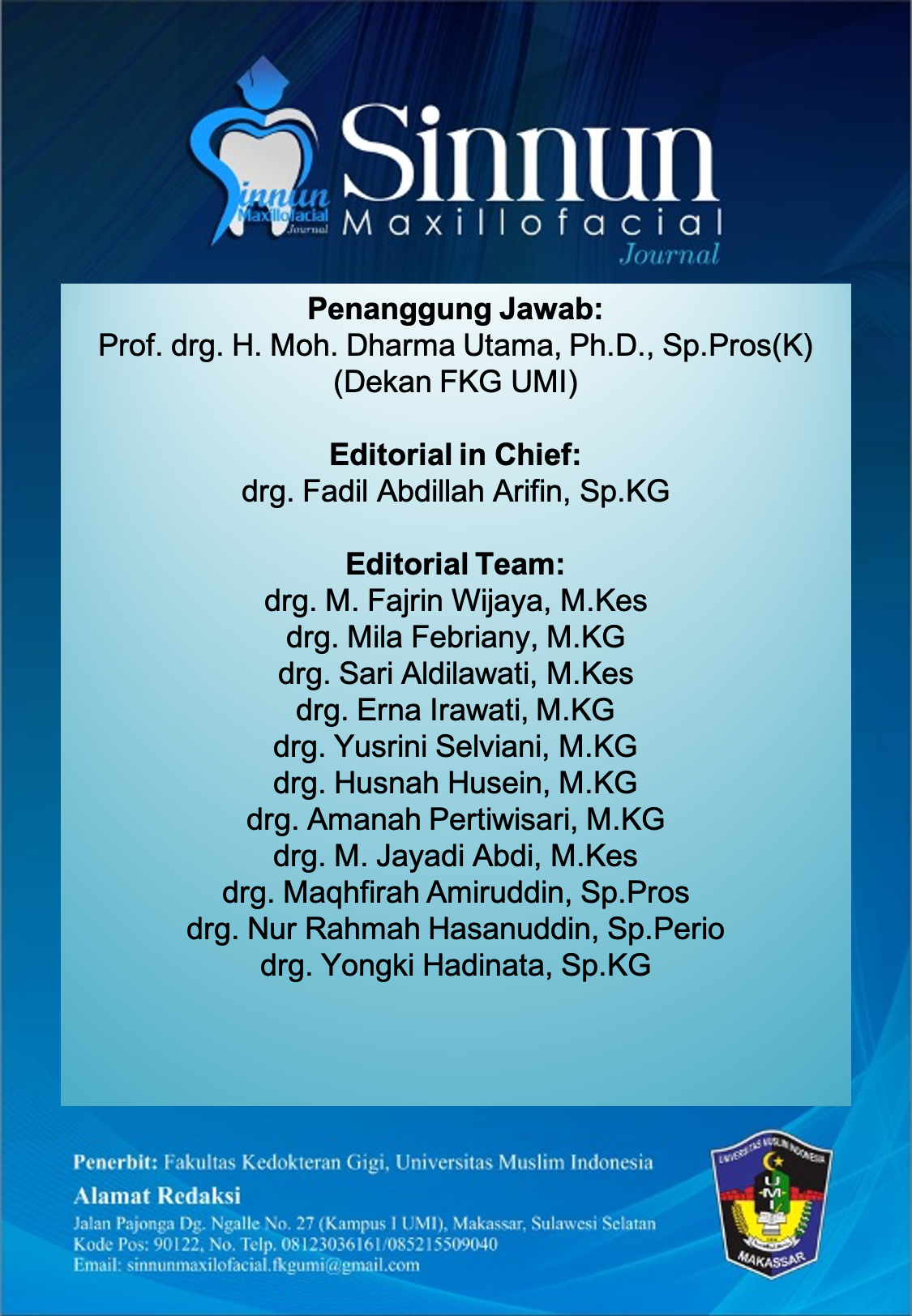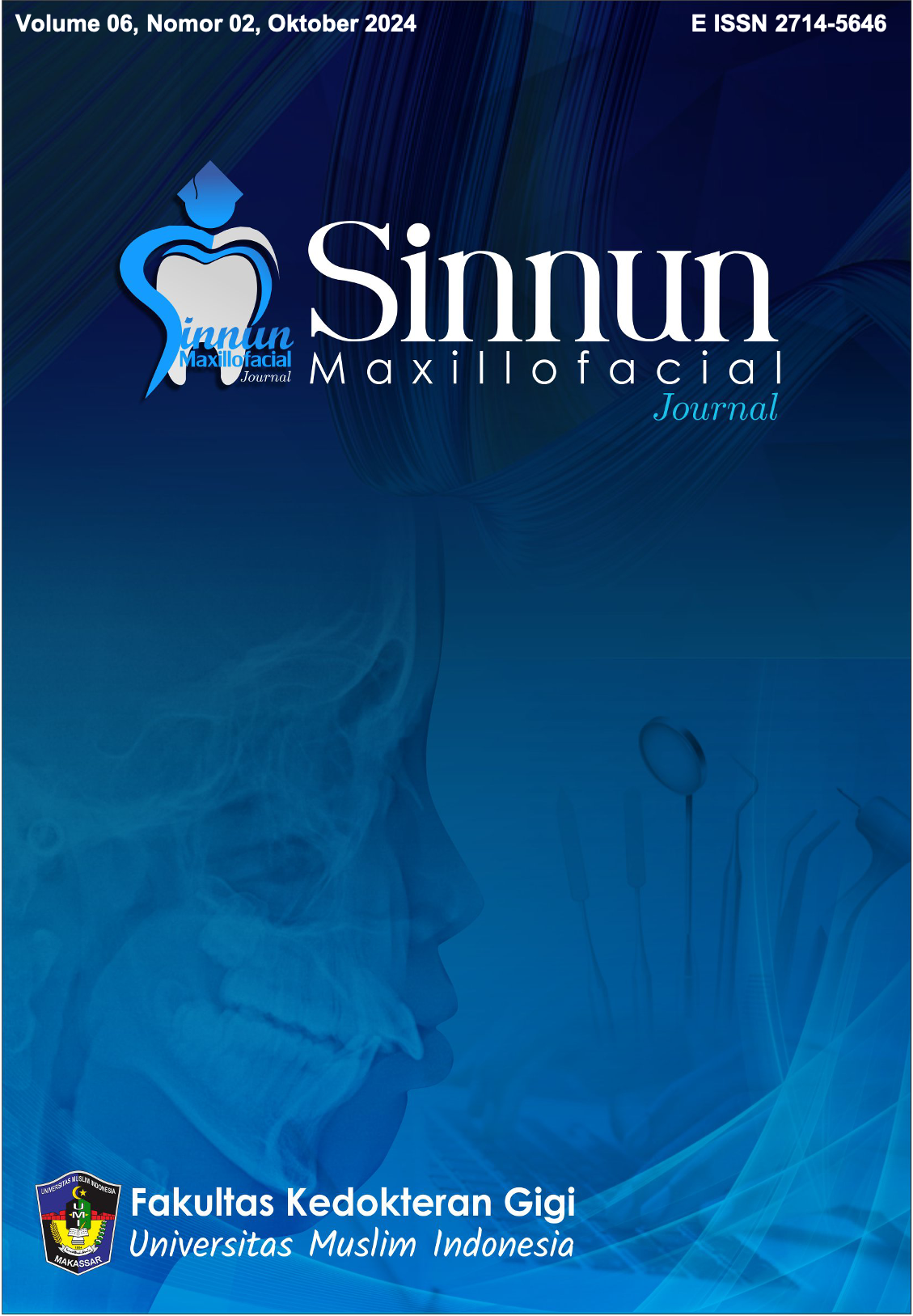 Sinnun Maxillofacial Journal is a publication of scientific work in the field ofdentistry in a broad sense such as peridodontic, pedodontic, conservative dentistry, endodontic, dental material, oral biology, oral and maxillofacial surgery, prosthodontic, orthodontic, dental radiolgy, dental medicine and community dentistry. In addition, the Journal was first established since 2019 by the Institute of Study and Management Center Journal of the Faculty of Dentistry Universitas Muslim Indonesia located in Makassar, South Sulawesi. Sinnun Maxillofacial Journal published on April and October with E-ISSN 2714-5646. This journal has also collaborated with Persatuan Dokter Gigi Indonesia (PDGI) in terms of assisting the advancement of dental health and disseminating research results.