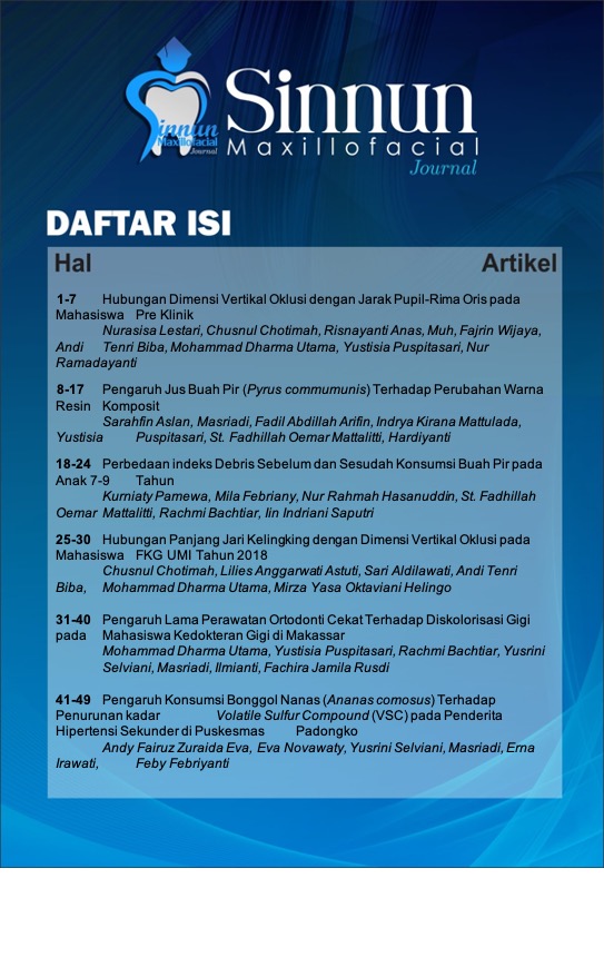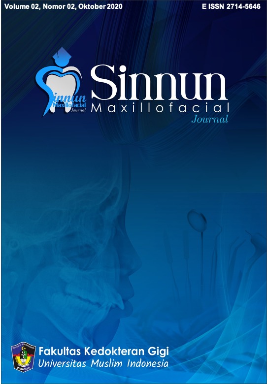 Sinnun Maxillofacial Journal is a publication of scientific work in the field ofdentistry in a broad sense such as peridodontic, pedodontic, conservative dentistry, endodontic, dental material, oral biology, oral and maxillofacial surgery, prosthodontic, orthodontic, dental radiolgy, dental medicine and community dentistry. In addition, the Journal was first established since 2019 by the Institute of Study and Management Center Journal of the Faculty of Dentistry Universitas Muslim Indonesia located in Makassar, South Sulawesi. Sinnun Maxillofacial Journal published on April and October with E-ISSN 2714-5646. This journal has also collaborated with Persatuan Dokter Gigi Indonesia (PDGI) in terms of assisting the advancement of dental health and disseminating research results.