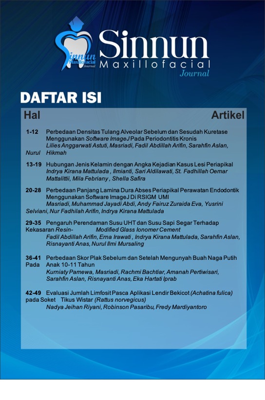 Sinnun Maxillofacial Journal is a publication of scientific work in the field ofdentistry in a broad sense such as peridodontic, pedodontic, conservative dentistry, endodontic, dental material, oral biology, oral and maxillofacial surgery, prosthodontic, orthodontic, dental radiolgy, dental medicine and community dentistry. In addition, the Journal was first established since 2019 by the Institute of Study and Management Center Journal of the Faculty of Dentistry Universitas Muslim Indonesia located in Makassar, South Sulawesi. Sinnun Maxillofacial Journal published on April and October with E-ISSN 2714-5646. This journal has also collaborated with Persatuan Dokter Gigi Indonesia (PDGI) in terms of assisting the advancement of dental health and disseminating research results.